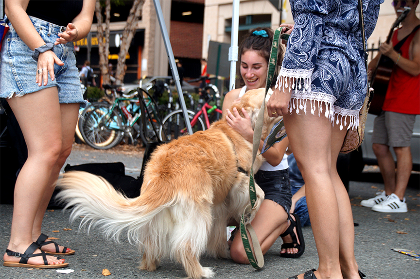 Ivonne Alonzo makes her contribution to the Collaborative Canvas at Vigilante Coffee Company and Living Artists & Co’s joint Flow into Fall event Sunday, September 29,2019. The Collaborative Canvas was a huge hit among visitors as each participant engaged with the work in their own way.(Photo by Maya Koeppen)Emma Weisbaum plays with a furry friend at Vigilante Coffee Company and Living Artists & Co’s joint Flow into Fall Event Sunday, September 29, 2019. Living Artists & Co is a community organization devoted to “enabling artists to form sustainable business practices through entrepreneurial training, education, and practical opportunities” according to the group’s Instagram bio. (Photo by Maya Koeppen)Seniors Laila Rose and Meredith McVadon chat while working on the Collaborative Canvas at Vigilante Coffee Company Sunday, September 29, 2019. Past joint-events have included free sticker making and terra cotta pot painting. (Photo by Maya Koeppen)Emma Weisbaum’s Collaborative Canvas sits outside the College Park cafe Sunday, September 29, 2019. Weisbaum has created other works that are showcased on her Instagram @emmaweisbaum . (Photo by Maya Koeppen)Students, artists and members of the community gather outside Vigilante Coffee Company on Baltimore Ave for the cafe’s joint Flow into Fall event with Living Artists & Co Sunday, September 29,2019. Future events can be found on the @VigilanteCoffee Instagram and Facebook pages. (Photo by Maya Koeppen)Jacob Mast chats with senior Laila Rose while working on a jewelry piece Sunday, September 29, 2019. Wire wrapping is “one of the oldest techniques for making handmade jewelry” according to Wikipedia. (Photo by Maya Koeppen)Jacob Mast lays out his wire wrapping materials on a woven-mat in front of Vigilante Coffee Company Sunday, September 29, 2019. Mast also attended Vigilante’s SK8 + Coffee event back in August that featured a demo from local professional skater, Orange Man and a free sticker making station. (Photo by Maya Koeppen)