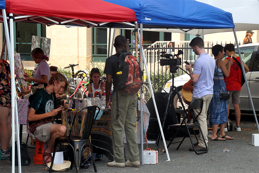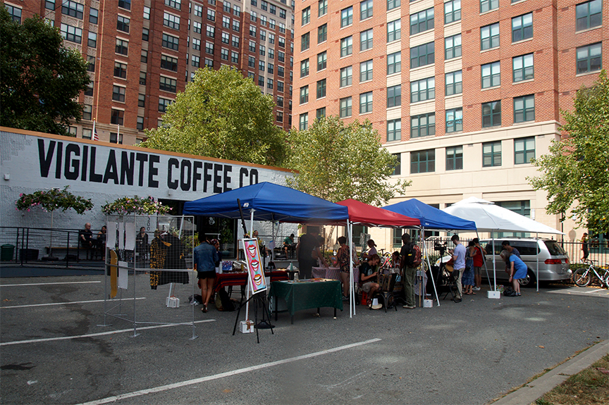 Art vendors and musicians line the parking lot of Vigilante Coffee Company off Baltimore Ave. Saturday, September 29, 2019. (Photo by Maya Koeppen)
