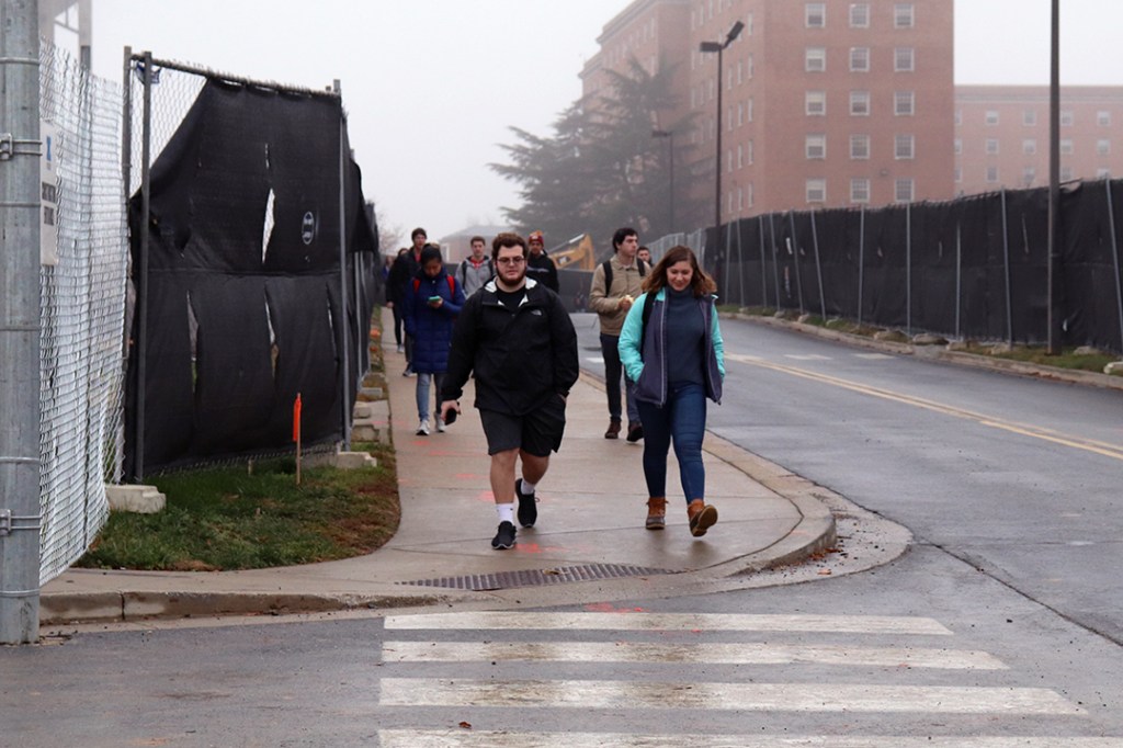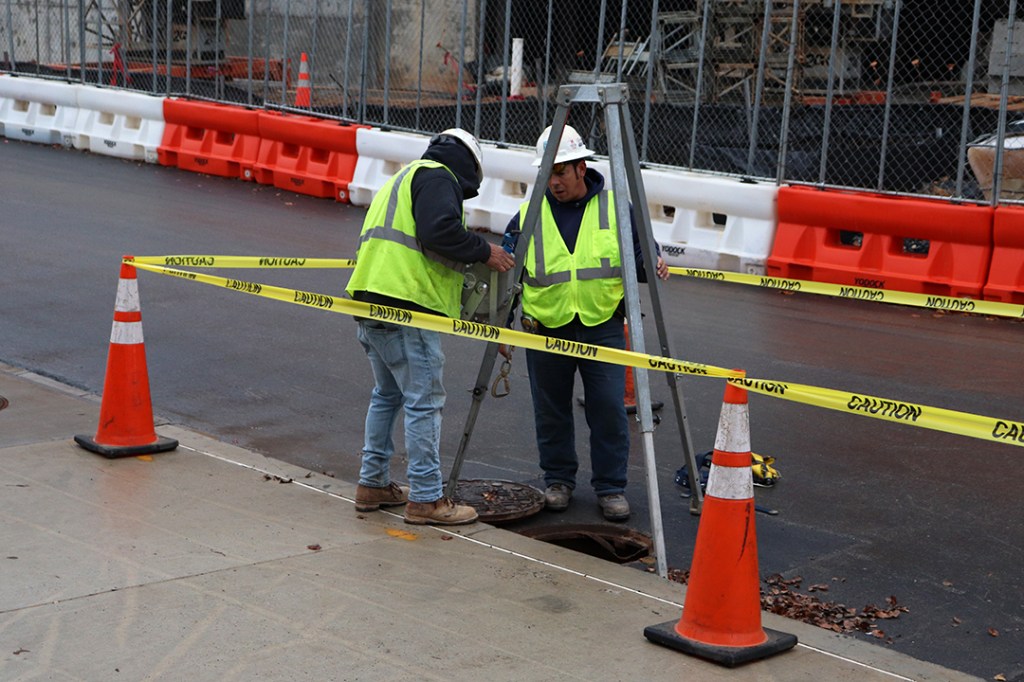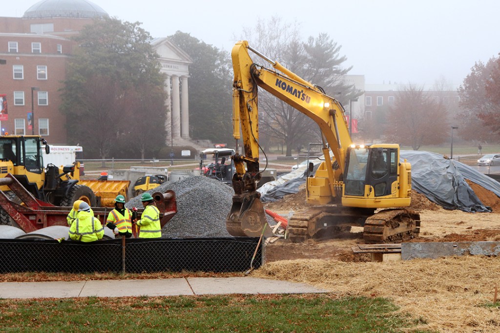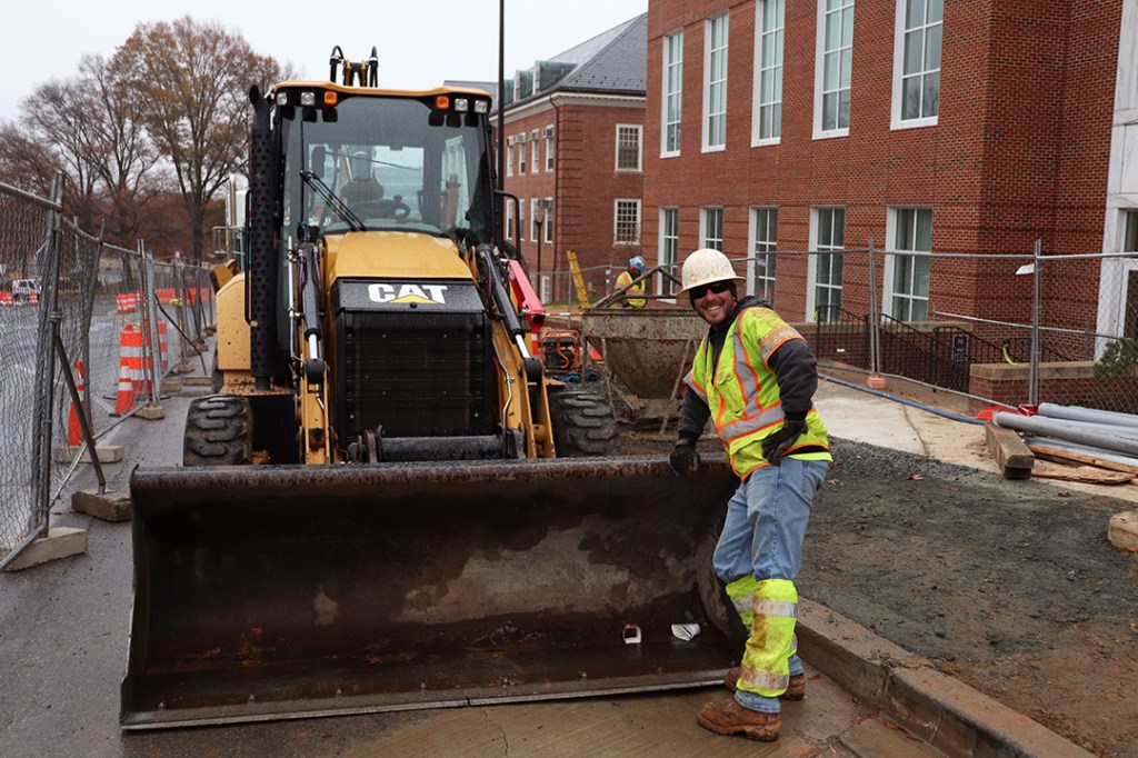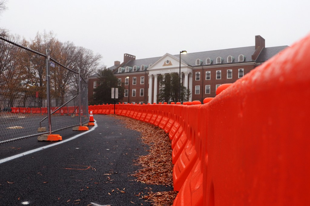 A danger sign keeps pedestrians out of a work zone located on the north campus of the University of Maryland, College Park, Monday, Dec. 9, 2019. At the site, the varsity practice fields are being replaced with two residence halls, just one of the many current projects at UMD. (Photo by Michael Purdie)Carlos Alvarez drives a drum roller over asphalt next to Cumberland Hall at the University of Maryland, College Park, Monday, Dec. 9, 2019. Due to the construction of two new residence halls, construction workers must redirect the path of Farm Drive. (Photo by Michael Purdie)Construction workers build the new Cole Field House at the University of Maryland, College Park, Friday, Dec. 6, 2019. The original field house was demolished in 2016, and the completion of the new building will total around $196 million. (Photo by Michael Purdie)A construction worker rides a lift while working towards the completion of the new Cole Field House at the University of Maryland, College Park, Friday, Dec. 6, 2019. The field house is to be used by the football team and was originally projected to be finished this year; however, it is unknown when it will actually be completed. (Photo by Michael Purdie)The Washington Quad at the University of Maryland, College Park features a new turf field that was completed last week, Friday, Dec. 6, 2019. The turf was replaced with a cork base as the old material was deemed a carcinogen, and the new field is said to be more environmentally friendly. (Photo by Michael Purdie)An excavator is used in the development of the new M Circle at the University of Maryland, College Park, Monday, Dec. 9, 2019. The university’s famous landmark is being relocated 60 yards away from the original due to the construction of the Purple Line, which will run through campus. (Photo by Michael Purdie)Orange traffic barriers line the pavement around the M Circle at the University of Maryland, College Park during the construction of the new circle, Monday, Dec. 9, 2019. Barriers like these can be found all around campus since sidewalks are closed off, forcing pedestrians to walk on the side of the road. (Photo by Michael Purdie)Curtis Brown lifts tools out of the bed of his work truck outside of the Cole Field House at the University of Maryland, College Park, Monday, Dec. 9, 2019. Brown and the other construction workers alongside him said they have been working on the new field house together since 2017. (Photo by Michael Purdie)Jaime Cabrera and Milton Reyez work together to fix a sewer drain on the north campus of the University of Maryland, College Park, Monday, Dec. 9, 2019. The tool they are using can pully items down into the drain or latch onto things below. (Photo by Michael Purdie)Construction worker John Wright stands next to a compact tracker during renovations to Edward St. John Learning and Teaching Center at the University of Maryland, College Park, Monday, Dec. 9, 2019. Wright said that even though he does serious work, he “likes to have fun on the job and goof off from time to time.” (Photo by Michael Purdie)Lights from the trucks of construction workers flash in the distance behind a fence during the construction of the new M Circle at the University of Maryland, College Park, Monday, Dec. 9, 2019. Fences are placed all around campus to keep pedestrians out of construction zones, forcing the closure of many sidewalks. (Photo by Michael Purdie)Students walk on the sidewalk next to the varsity practice fields at the University of Maryland, College Park with construction happening on both sides of them, Monday, Dec. 9, 2019. Students are forced to use this pathway as many the surrounding ones are closed off due to the construction of a new dining facility and two residence halls. (Photo by Michael Purdie)The lobby of Cumberland Hall at the University of Maryland, College Park is left barren after the front desk was temporarily removed this semester, Friday, Dec. 6, 2019. In the meantime, resident assistants and community assistants are forced to work out of a study room that they took over on the first floor. (Photo by Michael Purdie)Two construction workers chat while on an excavator in a restricted construction area at the University of Maryland, College Park, Monday, Dec. 9, 2019. The site will be turned into two new residence halls, which are projected to be opened for the 2021-2022 academic year. (Photo by Michael Purdie)Ronnie Vaughn and Dave LaTona discuss construction plans while walking towards their truck in Lot Z at the University of Maryland, College Park, Monday, Dec. 9, 2019. The two are a part of the team working on the development of the new Cole Field House. (Photo by Michael Purdie)